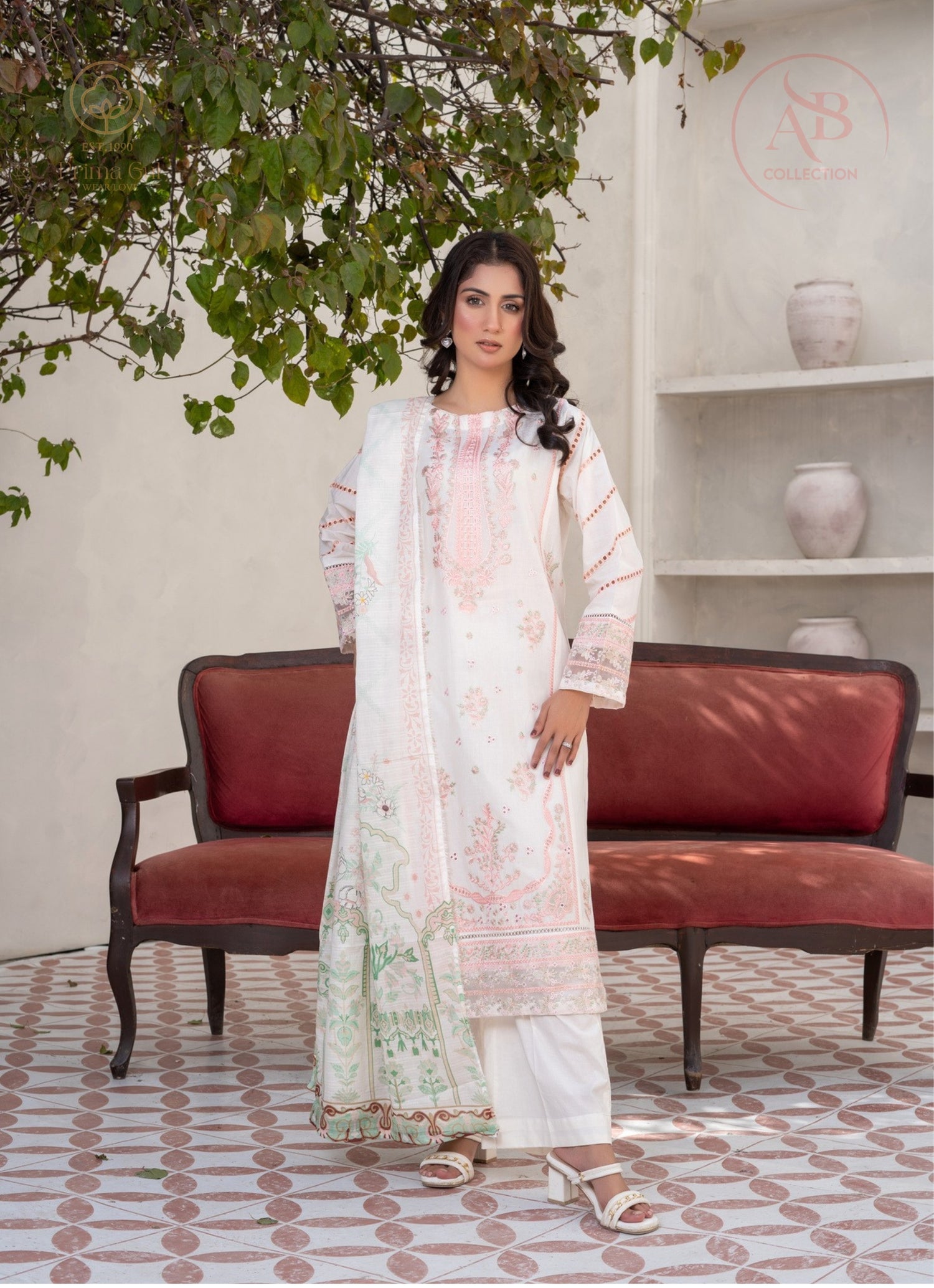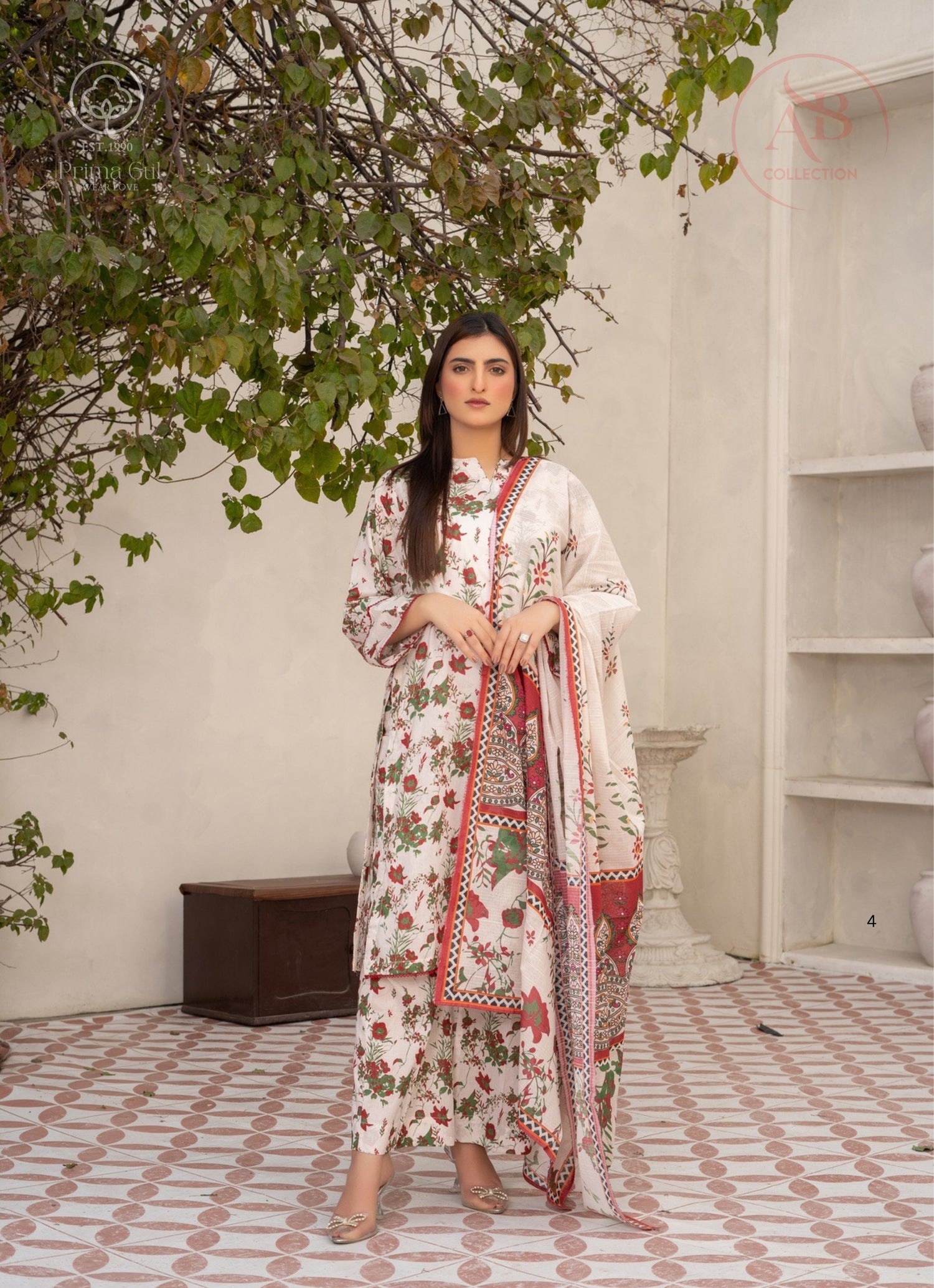 3-Piece Monochrome Lawn Suit with Floral Contrast Dupatta
